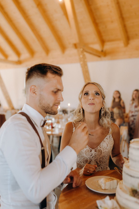 Po obřadu následovala svatební hostina ve stodole, která nabídla příjemné zázemí, atmosféru a dostatek prostoru pro společné chvíle. Velkým a velmi osobním prvkem byl svatební dort a sweet bar, které připravoval sám ženich. Obdivuhodné.