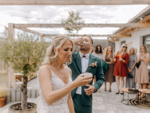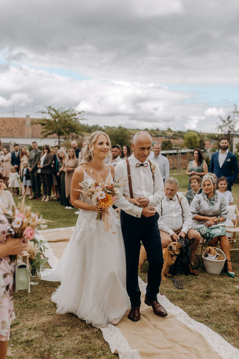 Samotný obřad proběhl v areálu Stodoly pod lesem, obklopené zelení a nádhernou květinovou výzdobou. Svědkyněmi se staly sestry, což krásně podtrhlo rodinný charakter svatby. Jeden z nejmilejších okamžiků přišel ve chvíli, kdy ženich přicházel k oltáři se svými pejsky. Obřad byl přesně takový, jaký si pár přál. Plný hlubokých myšlenek s důrazem na lásku, respekt a rodinu.
